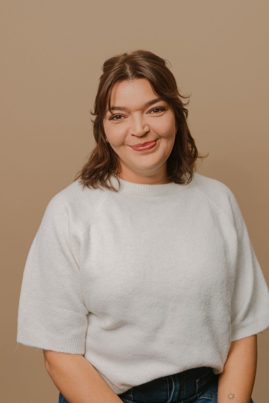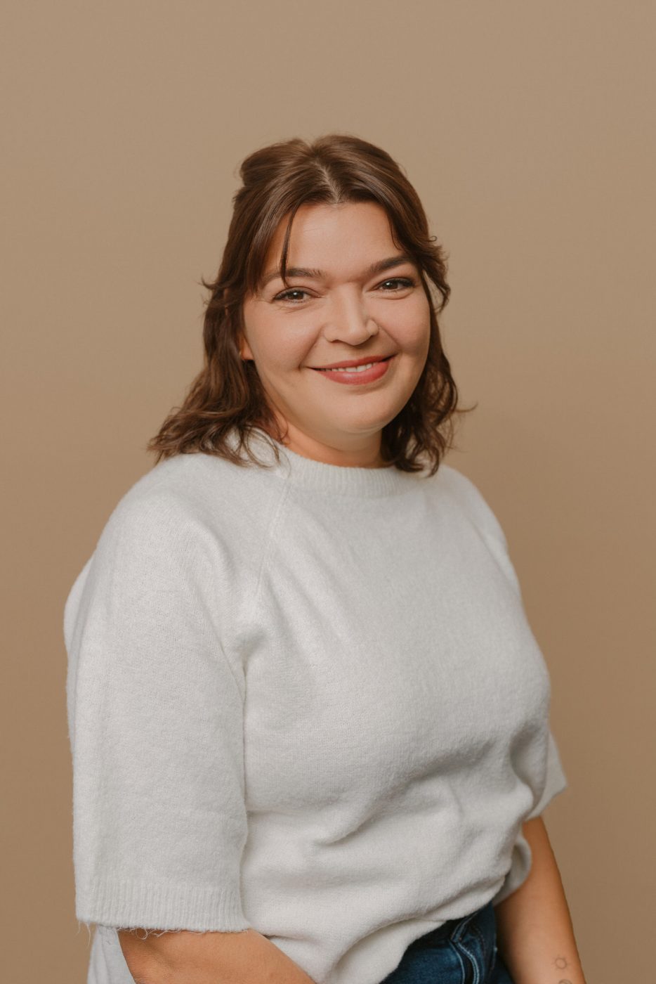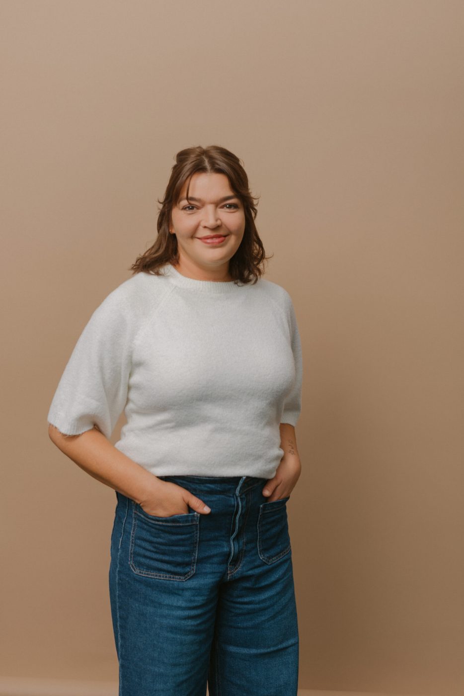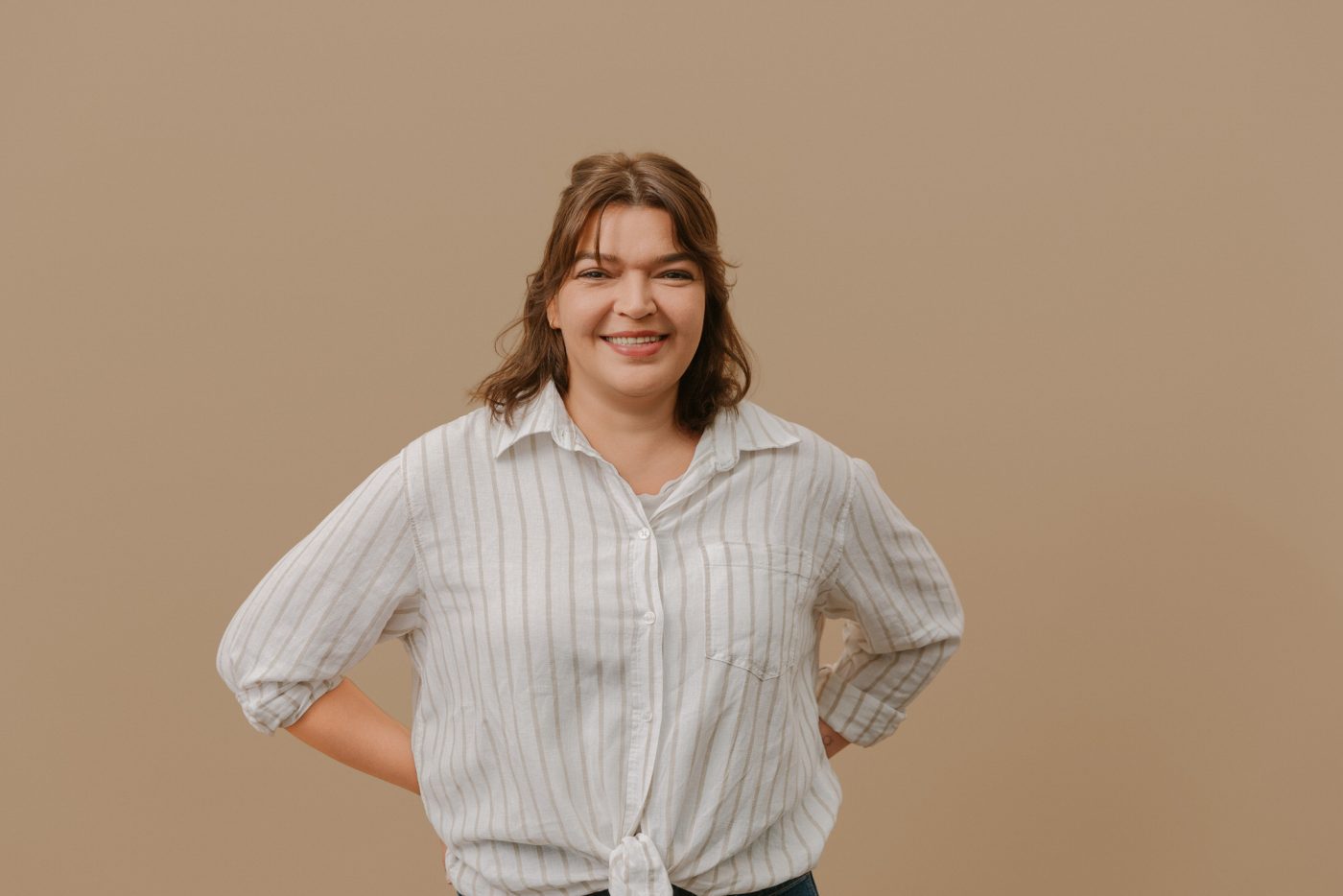 Für ihre Website, und die dazu gehörigen Social Media Accounts, brauchte sie noch einige natürlich aussehende Studiofotos. Die sollten – passend zu ihr und ihrer Arbeit – etwas lockerer daher kommen. Einige klassische Portraits, zum Beispiel als Profilbild sollten. Für den Mocha-farbenen Hintergrund haben wir uns entschieden, da er gut zum Design von Jessicas Website passt.
