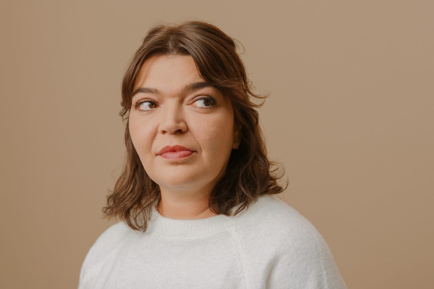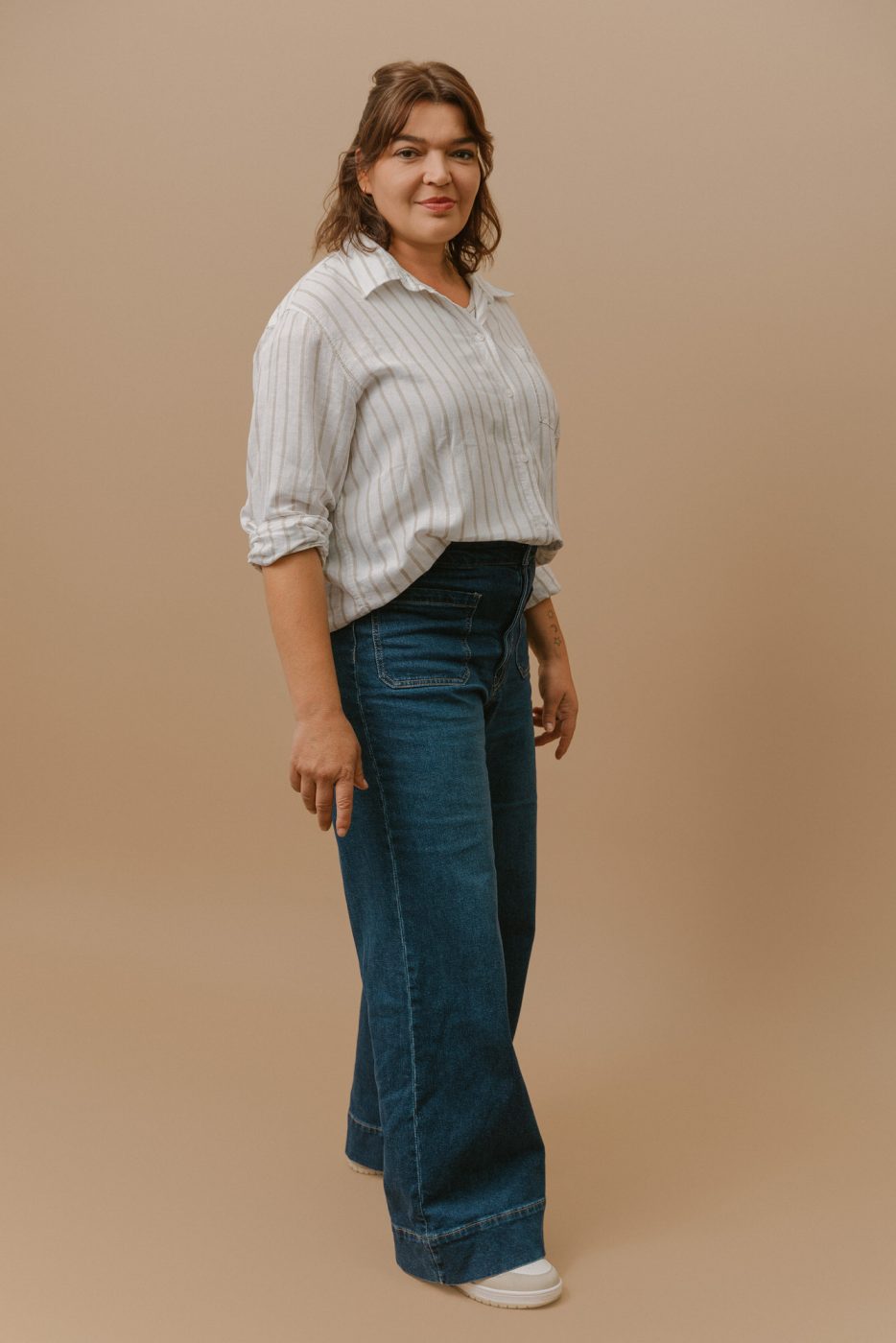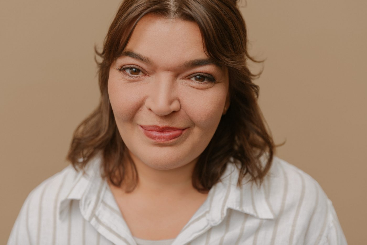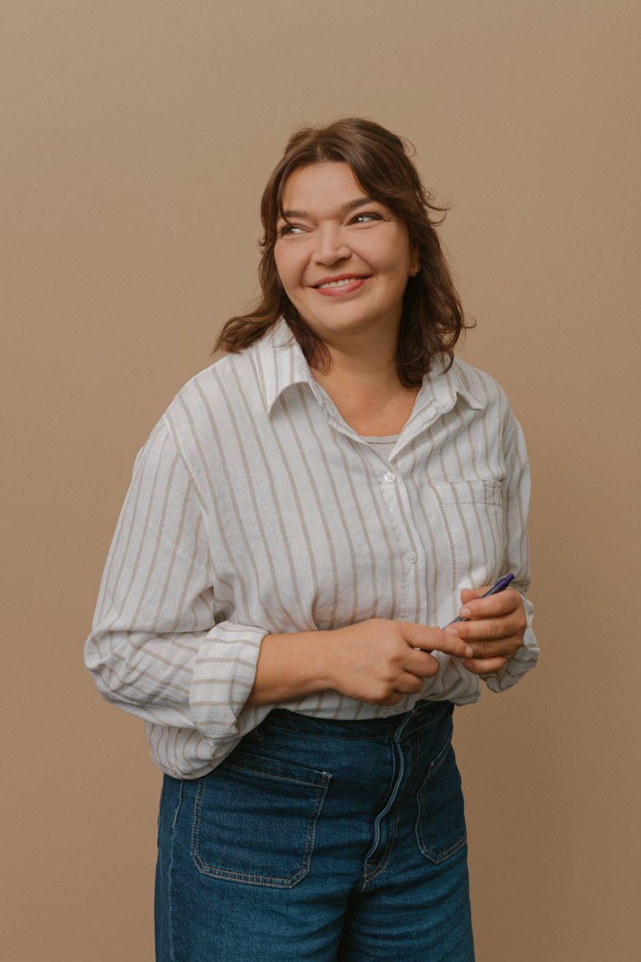 Für ihre Website, und die dazu gehörigen Social Media Accounts, brauchte sie noch einige natürlich aussehende Studiofotos. Die sollten – passend zu ihr und ihrer Arbeit – etwas lockerer daher kommen. Einige klassische Portraits, zum Beispiel als Profilbild sollten. Für den Mocha-farbenen Hintergrund haben wir uns entschieden, da er gut zum Design von Jessicas Website passt.